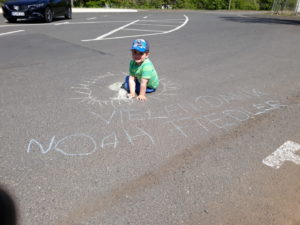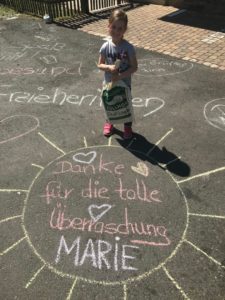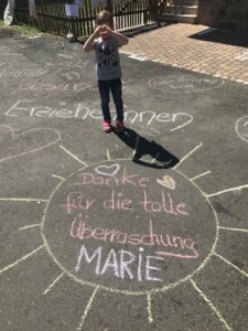 Dort wo sonst immer viele Autos stehen, fand man bunt gemalte Bilder und liebevolle Grüße. So kam ein wenig Farbe in diese graue Zeit.